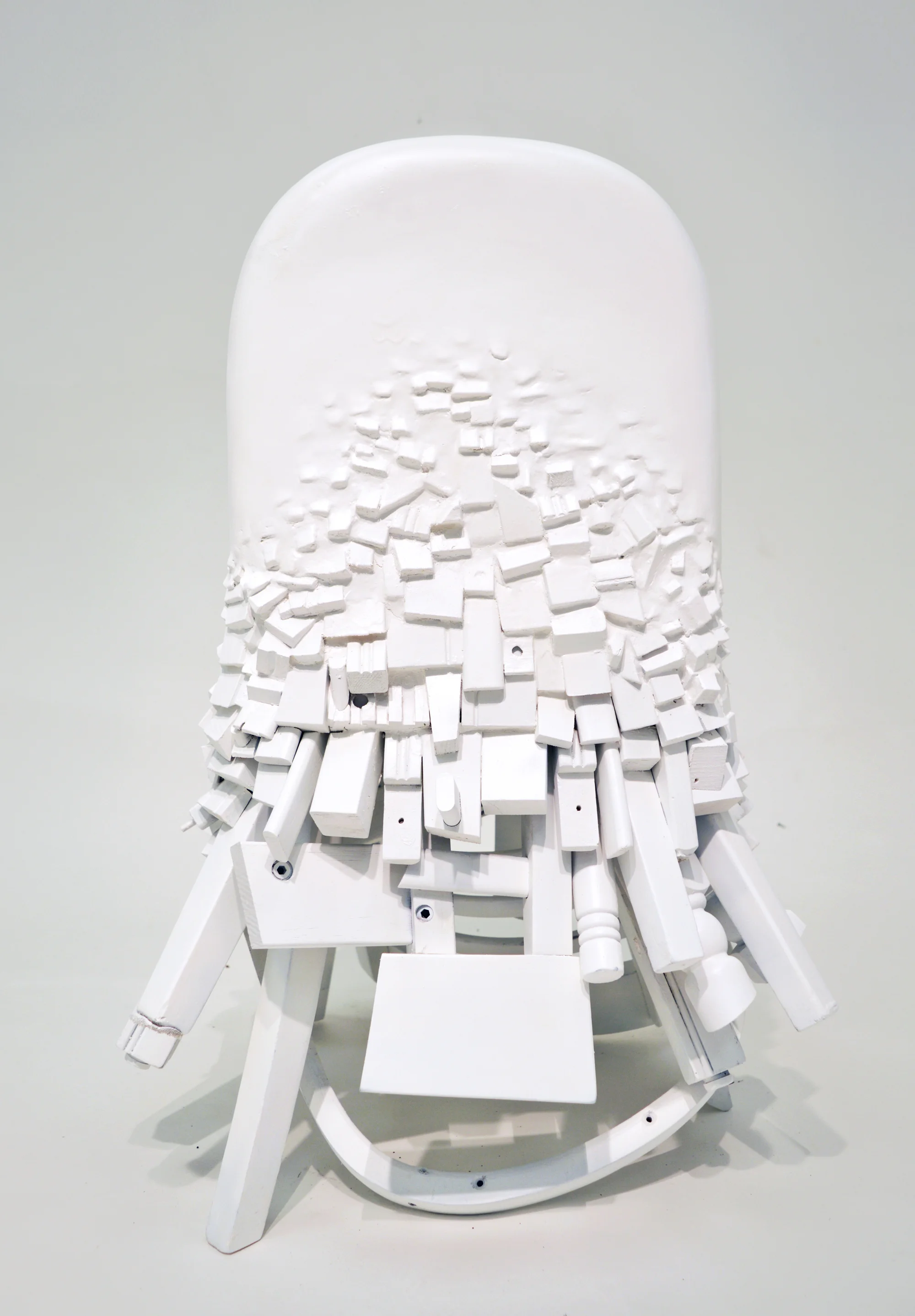 The Fused Chair is made of parts from five different broken or unwanted dining chairs. The chairs were painted white, chopped into smaller and smaller fragments, and then re-formed into a smooth seating surface. This piece represents a transformation -- a gradient from distinct parts to an unrecognizable matrix to a homogeneous soup.